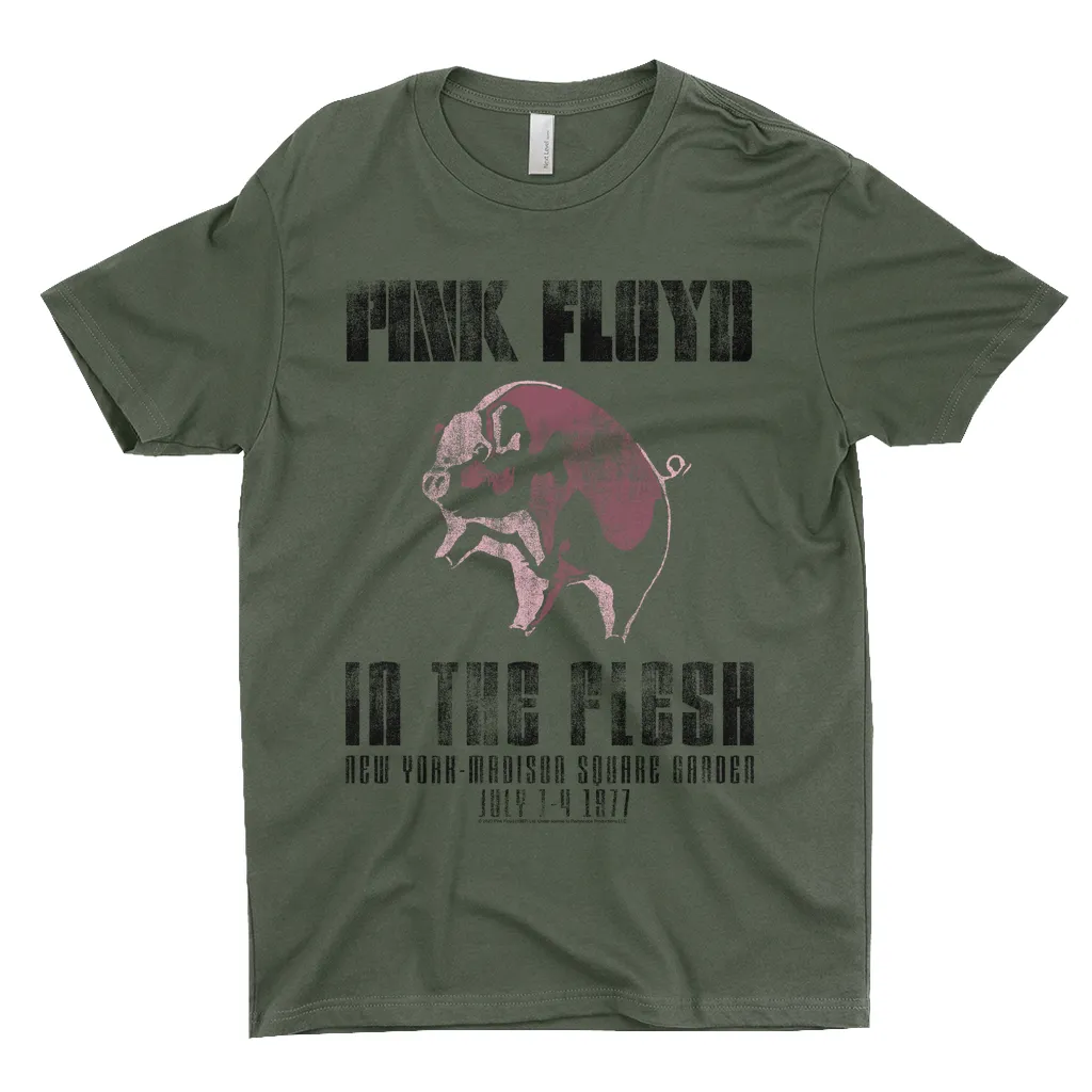 Authentic Pink Floyd Merchandise100% Cotton (except Heather Grey, which is 90% Cotton)In The Flesh 1977 NYC Madison Square Garden Concert T-Shirt Design Pink Floyd T-ShirtPhilosophical lyrics and experimentation are the foundation for the international fame of the band Pink Floyd. The band was formed in London in 1965 and is considered one of the most commercially successful groups of all time having sold over 250 million albums worldwide. Band members like Roger Waters have been cited as influences of countless artists including David Bowie, Queen, Tool, Radiohead, The Smashing Pumpkins, and U2.This shirt features the album artwork of Animals, released in January 1977. Animals was the tenth studio album by the band and consist of long-form compositions including the ever-popular song “Wish You Were Here”. The album is a concept album that provides a scathing critique of the socio-political conditions of late 1970s Britain and presents a notable change in musical style. Despite tension during recording, the band would promote the album during their In The Flesh tour. During this tour, Roger Waters would become agitated with the crowd which formed the basis for their next record, The Wall (1979). This fitted tee features a crew neck, set-in collar 1×1 Baby Rib and a tear away label. It has a slightly longer torso and it’s pre-washed to prevent shrinking. It’s made from 100% combed ring spun cotton, with the exception of Heather Grey, which is made from 90% cotton and 10% poly. Care Instructions: Machine wash cold. Do not bleach. Tumble dry low. Design DetailsFrontIn The Flesh 1977 NYC Madison Square Garden Concert T-Shirt Design