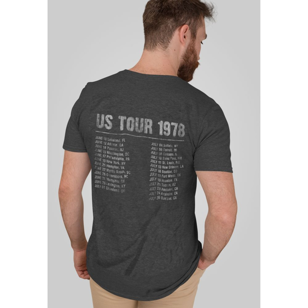 Distressed Print: Features vintage Rolling Stones tour graphics for an authentic retro look. The back features the group’s 1978 US tour dates.