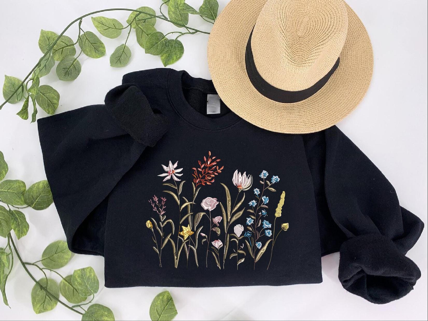 Embroidered sweatshirt with wildflower design. Suitable as a gift for flower and nature lovers. Classic unisex fit.